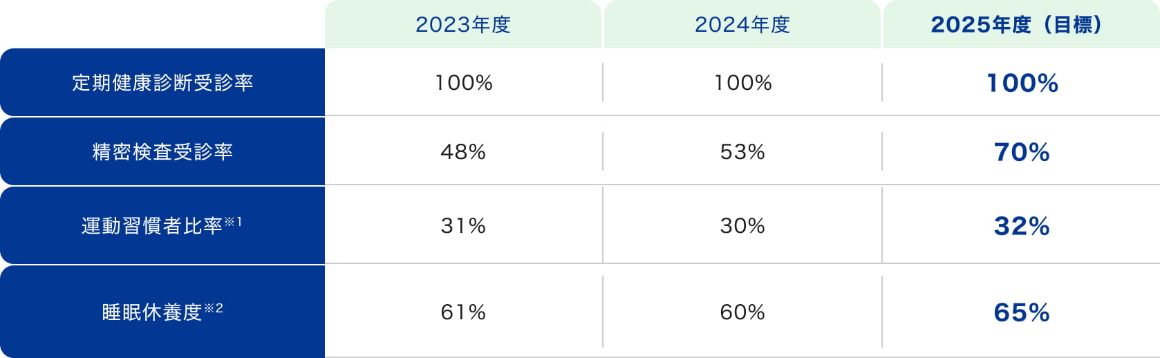 従業員に定期健康診断の受診を義務付けており、受診率は100%を維持しております。生活習慣病などのリスクが高い従業員には医療機関への受診勧奨、常駐保健師による保健指導、産業医面談などを行っております。